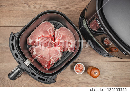 Raw pork chop meat with spices ready to cook in air fryer. top view
