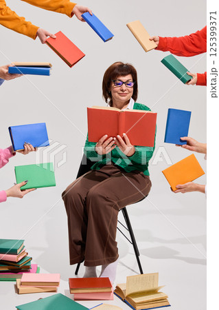 Elderly woman in green cardigan reading red book while surrounded by books and floating hands offering more against white background.