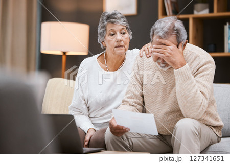 Stress, finance and senior couple planning retirement, mortgage anxiety and sad about pension paperwork. Depression, audit and elderly man and woman with a financial crisis and insurance mistake