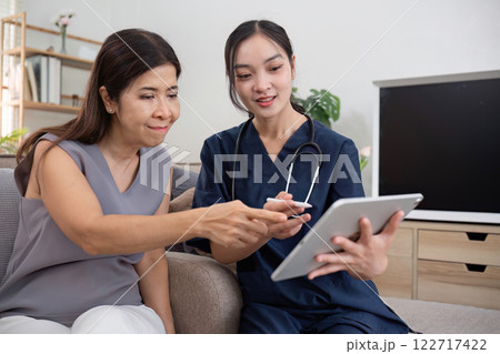 A caregiver and an elderly woman are giving advice and helping with a health check. At the home of an elderly woman