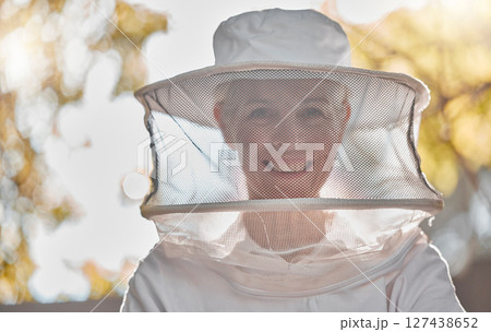 Beekeeper, woman and protective suit in portrait, happy and outddor with ppe, safety and agriculture. Senior bee farmer, happy and beekeeping at farm, backyard or nature to work in honey production