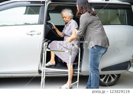 Caregiver help Asian elderly woman disability patient get in her car.