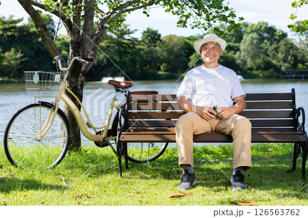 Peaceful Lakeside Moment: A relaxed senior man sits on a park bench, enjoying a sunny day by the lake with his bicycle nearby. A tranquil scene of serenity and leisure.