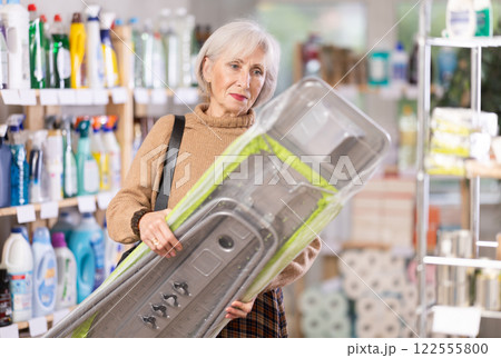 Portrait of smiling gray haired mature woman posing at white bathroom with body clean brush closeup