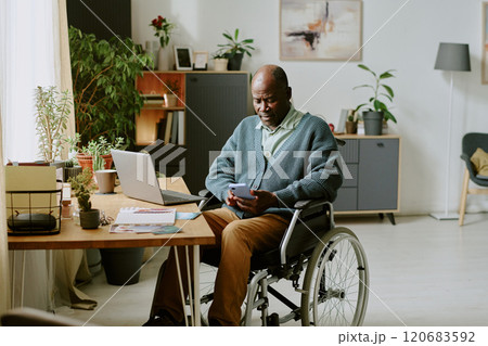 Man in wheelchair using smartphone while working from home office surrounded by books, plants, laptop, and desk setup in a bright, neatly organized room