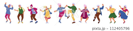 Elderly people dance. Senior dancers. Old woman and man. Party music. Grandmother and grandfather dancing. Healthy lifestyle. Retirement fun. Active choreography motions set. Vector tidy illustration