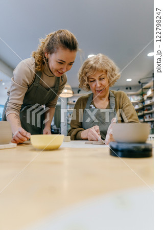 Two women work together with clay, developing skills and enjoying the artistic process. Elderly Caucasian woman learns pottery at a creative workshop with a young mentor