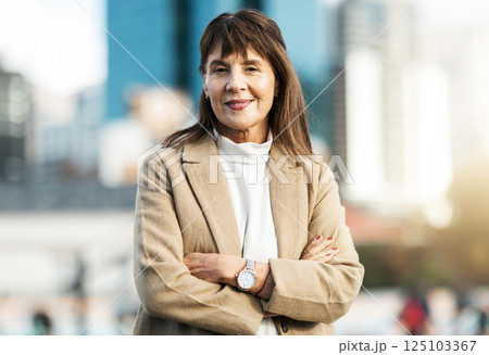 Senior business woman, portrait and arms crossed in city with smile. Vision, leadership and success mindset of mature female ceo, manager or company leader happy with goals, targets or career growth