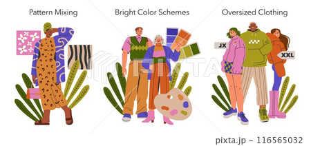 Fashion Trends set. Exploring pattern mixing, bright color schemes, and oversized clothing styles. Modern attire choices, bold fashion statements. Vector illustration.