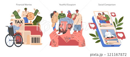 Midlife Crisis set. Challenges of aging, personal finance stress, chasing youth, social media comparison. Men facing life transitions. Vector illustration.