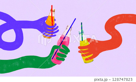Hand drawn collage of three colorful hands clinking fruit sodas in bottles with straws on purple background