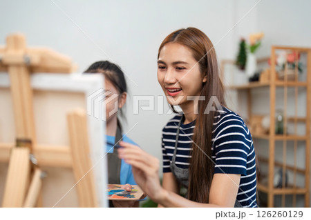 Family time with a mother teaching painting techniques to her child