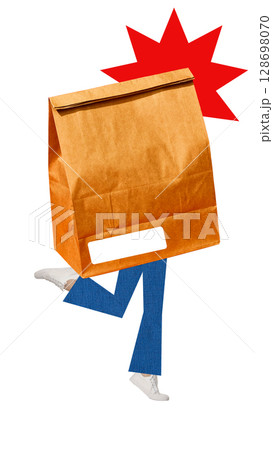 Creative digital artwork. Walking paper bag with starburst symbol showing urgency with energetic motion. Mockup for ads, text