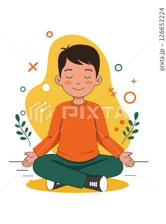 Boy Meditating in Lotus Pose with Relaxed Expression and Abstract Background Vector Illustration