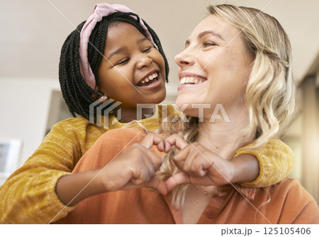 Heart sign, adoption and mother with black girl, happy together for bonding, loving and smile. Love, foster mother and daughter being cheerful, happiness and joyful to celebrate adopted child in home