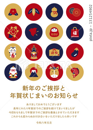 終活年賀状・年賀状じまいテンプレート 円形のカラフルな縁起物のアイコンイラスト / 2026年