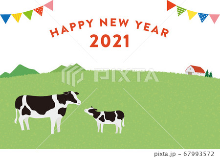 イラスト素材 2021年丑年 牛のイラストの年賀状テンプレート