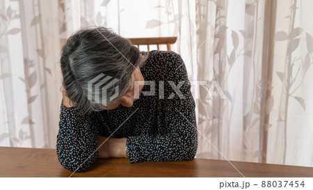 頭をもたげ考え込んでいる黒い服を着た高齢者女性