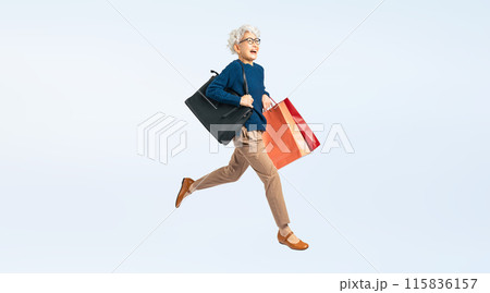 買い物バッグを持ってジャンプするシニア女性の全身写真