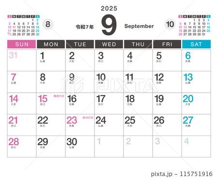 2025年(令和7年)のカレンダー 9月(祝日・六曜)