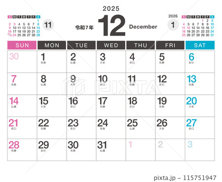 2025年(令和7年)のカレンダー 12月(祝日・六曜)