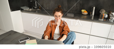 Work and life balance concept. Young woman in glasses, working from home, typing on laptop, student doing homework on computer, sitting in kitchen, freelancing