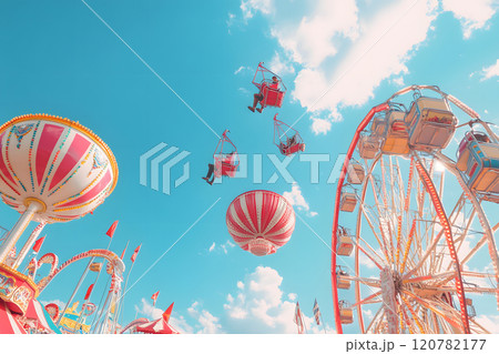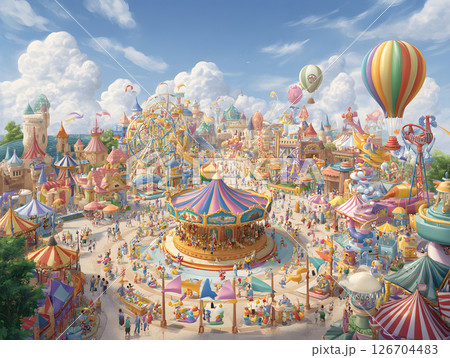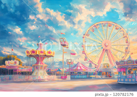 パステルカラーの空に浮かぶピンクの観覧車と遊園地