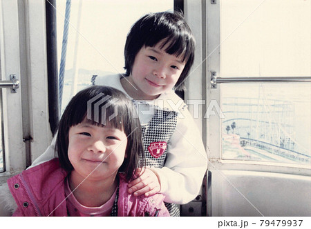 昔のフィルム写真 観覧車に乗る二人の女の子の姉妹