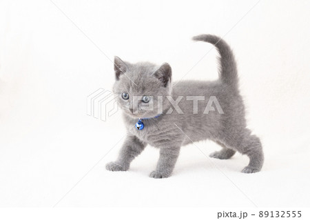 白バックと尻尾を上げたシャルトリューの仔猫