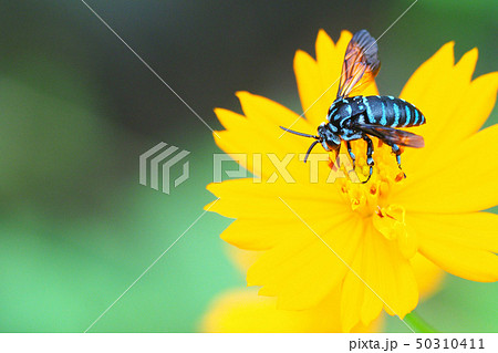ルリモンハナバチとキバナコスモスの花