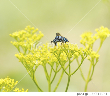 秋の七草オミナエシと青いハチ 夏 (高知県 三原村)