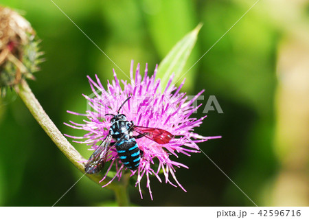 ルリモンハナバチとアザミの花