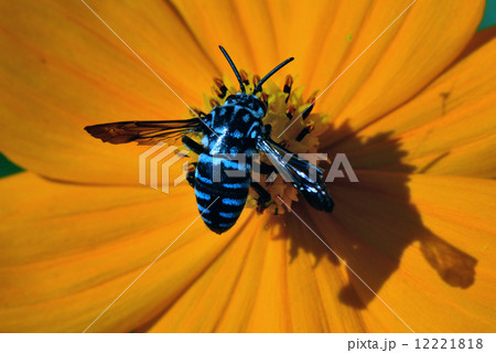 キバナコスモスの花を吸蜜するルリモンハナバチ