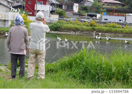 伊丹市昆陽池公園へ「幸せを運ぶ鳥」コウノトリ大量飛来