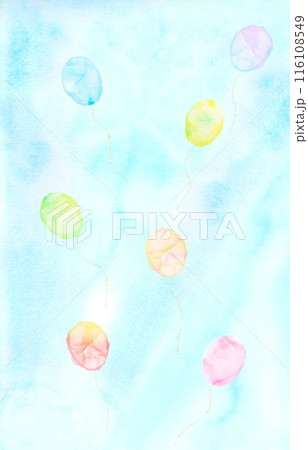青空を飛ぶカラフルな風船の縦長イラスト。やさしい雰囲気の水彩イラスト。
