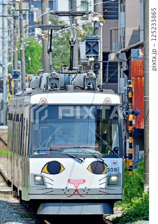 環七通りの若林踏切を通過する東急世田谷線幸福の招き猫電車