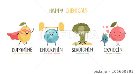 Oxytocin, serotonin, endorphin, dopamine. Hormones colorful vector illustration. Mood stabilizer, love hormone, reward chemical, pain reliever. Hormone health icon
