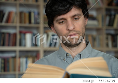 Handsome young man in elegant suit reading a book in modern luxury interior