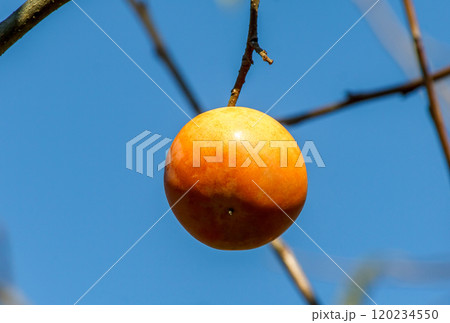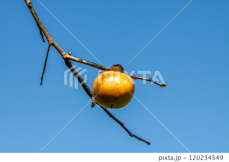 快晴の青空を背にしたカキノキの果実【カキノキ科】