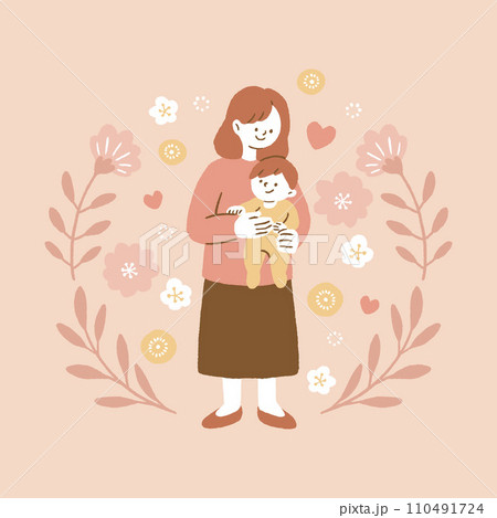 手繪母親與嬰兒擁抱的溫柔時刻與極簡風格花卉背景