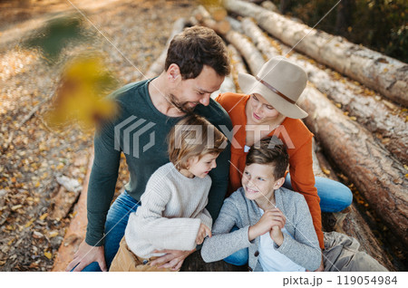 Portrait of family sitting on logs in the middle autumn forest. Nuclear family spending weekend outdoors.