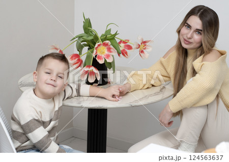 Concept family. Beautiful 19 year old girl and 5 year old boy sitting charmingly at the round table with a bouquet of red tulips, on a white background. Brother and sister bond.