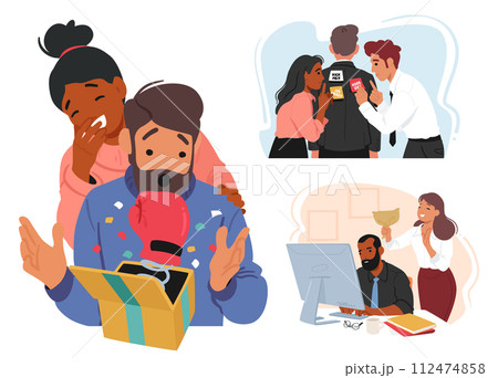 On April Fools Day Friend Characters Execute Harmless Pranks, Like Boxing Glove in Gift Box, Sticky Notes on Back