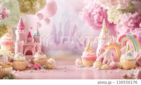Fairytale cupcake castle with unicorns and rainbows background for birthday party decoration