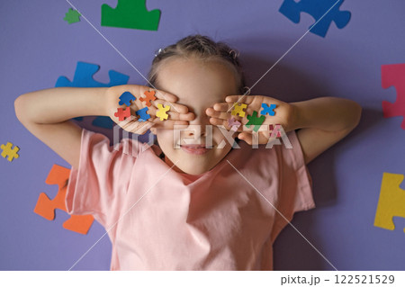 The child holds colored puzzle pieces in his hands, closing his eyes. The generally accepted international symbol of autism