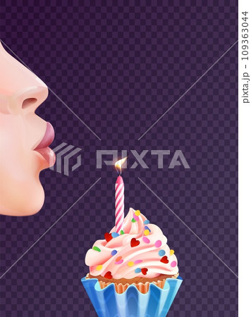 Girl blowing candle. Woman or kid blow on birthday cake and makes wish, realistic lips blows candles in sweet cupcake, party happy celebration fun dessert 3d vector illustration
