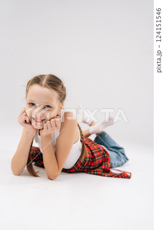 Vertical portrait of pretty 10 years old girl with braided hair in white tank top, red plaid shirt, lying on white backdrop, resting chin on hands, looking at camera. Concept of carefree childhood.