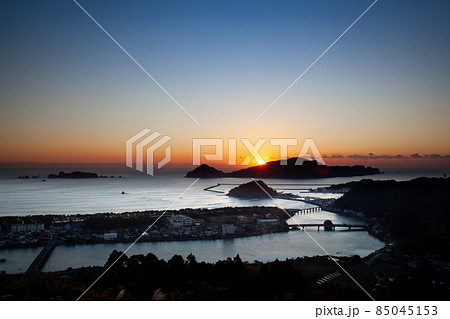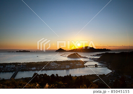 太平洋日向灘に昇る日出で黄昏色に染まった日南海岸の贄波浜と鳥帽子島に松島と黒島と間に広がる毛嵐