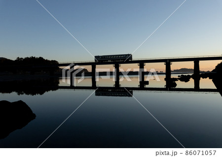 マジックアワーと共に昇る日出の宮崎県日南市山王の日南海岸山王浜を走るJR九州キハ40日南線通勤列車