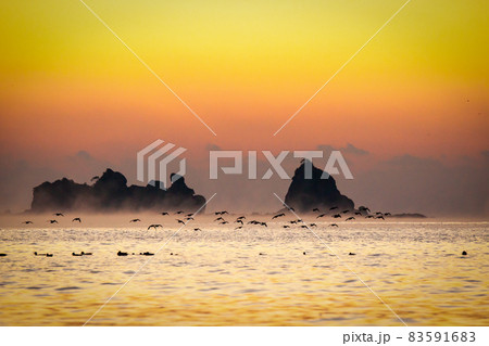 太平洋日向灘に昇る日出で黄昏色に染まった日南海岸の贄波浜と鳥帽子島に松島と黒島と間に着水する鴨群れ